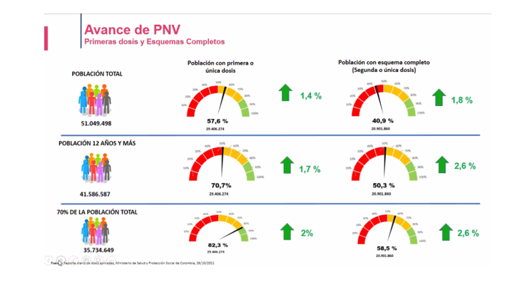 En ese orden, informó que hasta esta semana 57.6% de la población colombiana ya cuenta con al menos una sola dosis, lo que representa más de 29 millones de personas. Asimismo, 40,9 % ya tienen su esquema completo, lo que representa un total de 20.901.860 personas.